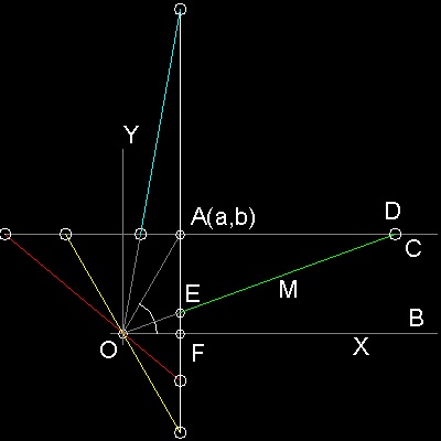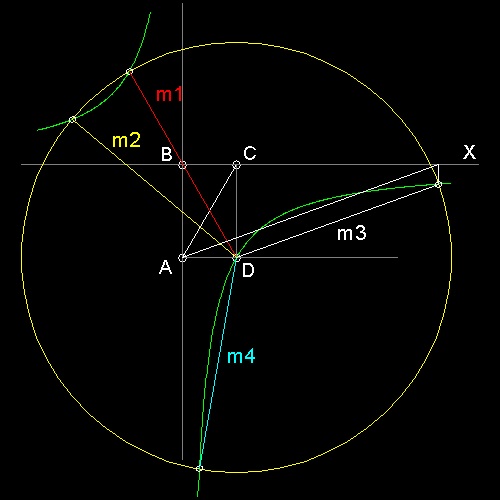 点A(a,b) を中心とする円の方程式: (x-a)2 + (y-b)2 = a2 + b2 直線 AC : y = b 直線 OD : y = tanα x = mx 直線 OD が 円、直線 AC と交わる点を E(x1,y1), D(x2,y2) とすると (ED)2 = (1 + m2)(x1 - x2)2 = a2 + b2 ∠AOB = π/3 , AO = 1 とすると a = 1/2, b = √3/2 となり m についての4次方程式がえられる。 f(m) = m4 - 4√3 m3 + 6m2 + 4√3 m - 3 = 0この図面の作成方法:
