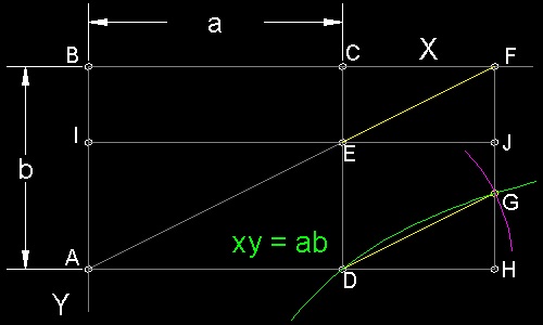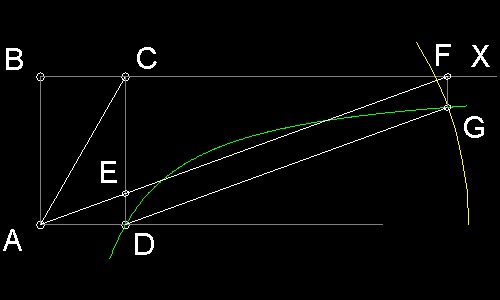 三等分する角度 ∠CAD = 60 ° であるから AD = BC =1, AB = CD = √3 , AC=2.0 である。 xy = ab = √3 の双曲線を 緑色で示す。 点D を中心として半径 4.0 の円との交点を G とする。 G から BCに垂線を下ろした点 が F である。 AF が ∠CAD の三等分線である。この図面の作成方法: