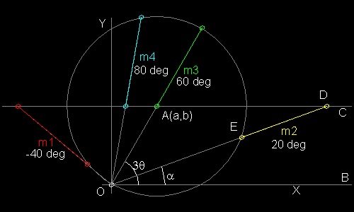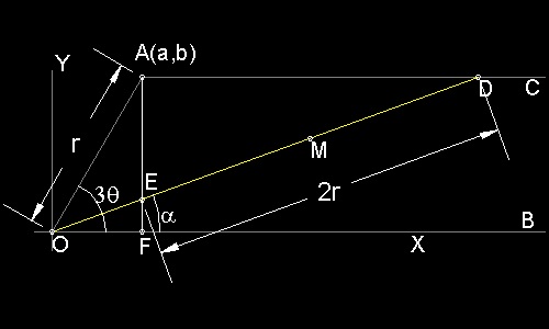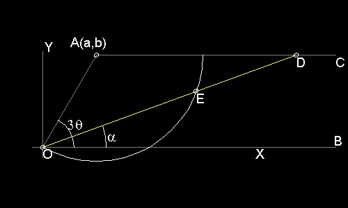 直線 AF : x = a ; 直線 AC : y = b 直線 OD : y = tanα x = mx 直線 OD が 直線 AF ,ACと交わる点を E(x1,y1), D(x2,y2) とすると (ED)2 = (x1 - x2)2 + (y1 - y2)2 = 4(a2 + b2) x1 = a, y1 = ma; x2 = b/m, y2 = b であるから (a - b/m)2 + (ma - b)2 = 4(a2 + b2) ここで (b/a) = tan(3θ) と置き換え 、上の式を整理すると F(m) = (m + tan3θ)(m3 - 3tan3θ m2 - 3m + tan3θ ) = 0 となり、 m についての4次方程式がえられるが (m + tan3θ) = 0 が 解でないことは 明白であるから 、三等分の方程式は f(m) = m3 - 3tan3θ m2 - 3m + tan3θ = 0 であたえられる。