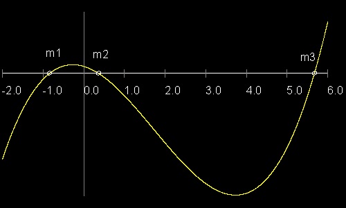 三次方程式は アルキメデスの挿入方の場合と同じであるが 参考のため F(m) のグラフを下に示す。