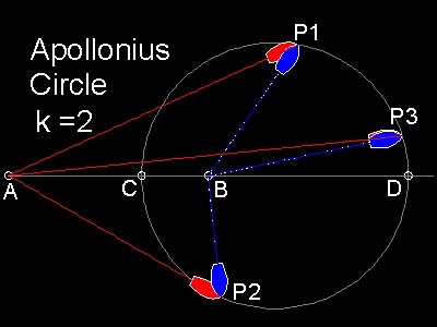 更にアポロニウスの円について: A と B の中点をO とし、AO = BO = r とすると OC = r*(K-1)/(K+1) OD = r*(K+1)/(K-1) アポロニウスの円の直径は r * 4K/(K2 -1) 中点"O"から円の中心までの距離は r*(K2 + 1)/(K2 - 1)