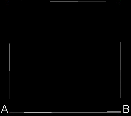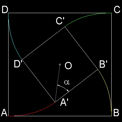 A,B,C,D からスタートして、ある時間が経った犬の位置を A',B',C',D' とする。