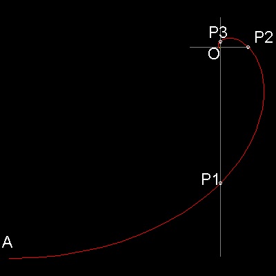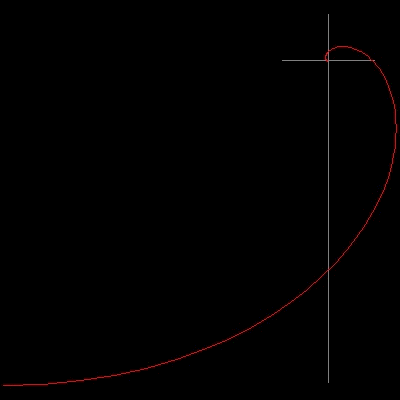 この曲線はx と y 軸をP1,P2,P3,...で切断する。そこで原点からの距離を図中で計ると OP1 = 0.455488, OP2 = 0.094687, OP3 = 0.019683 よって OP1/OP2 = OP2/OP3 = 4.8105 = eπ/2 これは OP3P2 と OP2P1 が相似であることを意味する. 即ち OP3P2 を時計回りに90度回転させ スケールを eπ/2 だけ 拡大すると、これら2つの曲線部分は重なり同一のものになる。 このことは、図面を表示して拡大し、曲線の一部分を コピーして90度回転し、そして尺度を4.8105で拡大すれば確められる。 *********** equiang_spiral.dwg ************ これは上に述べた特性(3)である。 他の特性についてもこの図面で確かめられる。自分で色々試してみてください。 この螺旋を中心の周りにズームしながら見ていくと等角螺旋 はいつまでも 続く曲線であることがわかる。 そのことを示したのが等角螺旋 - ズーム ビュー のアニメーションである。 この図面とアニメーションの作成方法: