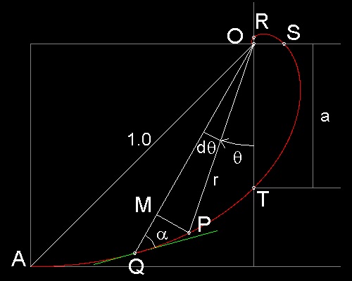 (但し MQ = dr , MP = r dθ) よって cot α = dr/rdθ   または   cot α dθ = dr/r ここで q に関して積分すると loger = θ cot α + loger0 (r0は θ = 0 の時の r の値) これは次のように書くことができる loge(r/r0) = θ cot α or r = r0 e θ cot α (ここでの ∠θ は時計回りにはかる) ************ equiangular_spiral_def.dwg ************* この例では、唯一わかっていて参照できる半径はOA (= 1.0)である。 それ故 r0= OA として、線分OA から時計回りで角度θ を取ると、 方程式は cot α = 1 であるから r = e-θ と簡素化できる。 (1) 全ての半径は一定の角度(α)で曲線によって切断される。 (2) 円弧の長さは半径に定数 S = R/cos α を掛けたもの。