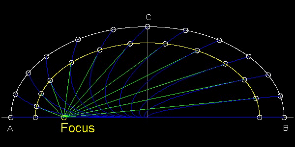 これらの軌跡は非常に短い線分からなる。各楕円を通る線分を延長するとこれらの線分は線AB と交差する。