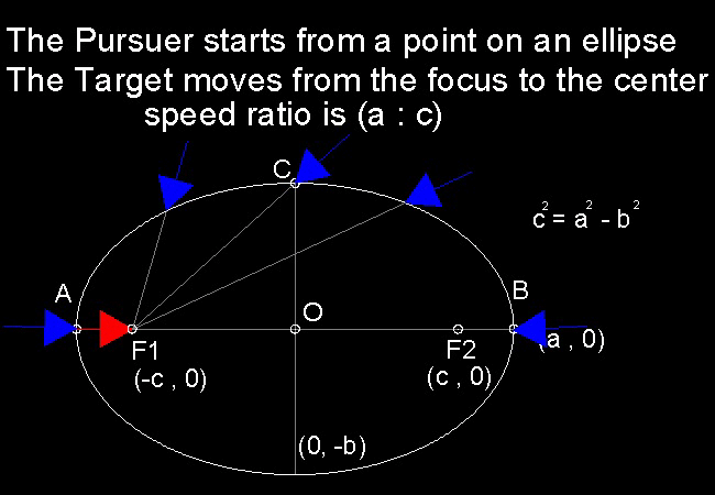 その違いは、標的はy-軸 ( x=0 線 )を上り下りし、追跡者は楕円上の任意の点から追跡しはじめることである。