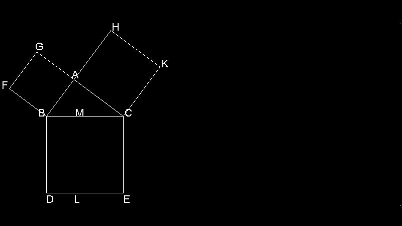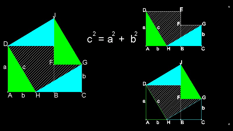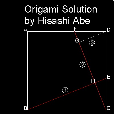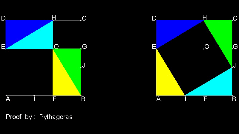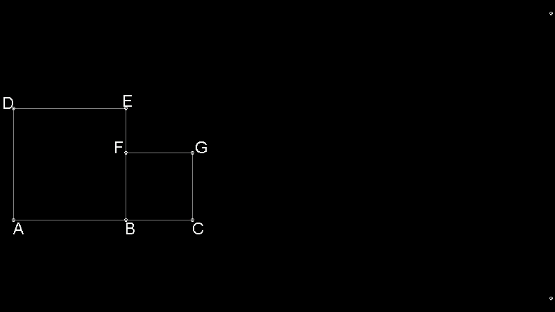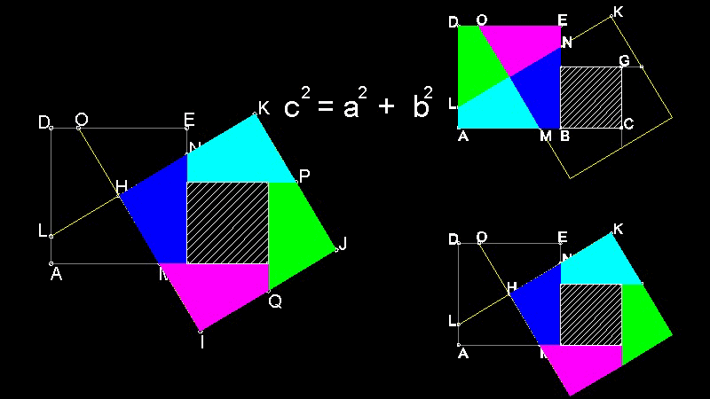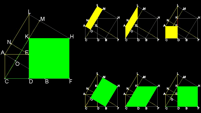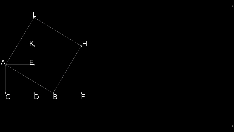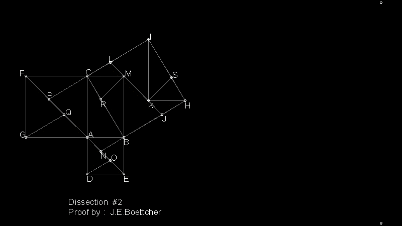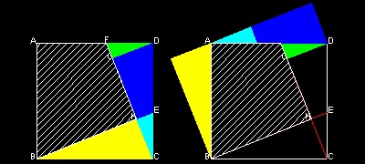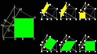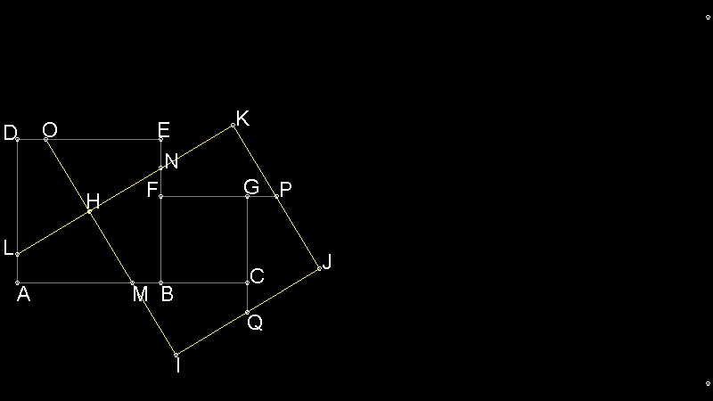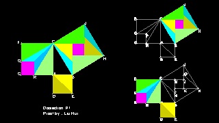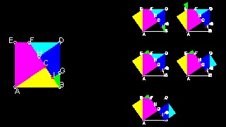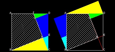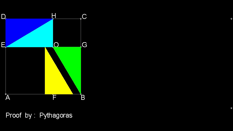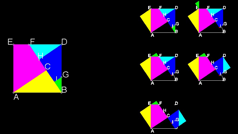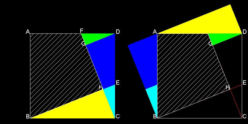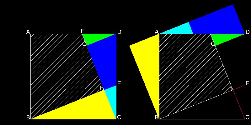 But this picture does not look neat. The reason is the gap between two small triangles,green and cyan. The picture would look nice and clean if cyan colored triangle and green colored triangle meet at point F. The following solution by Mario Pacek does just that.