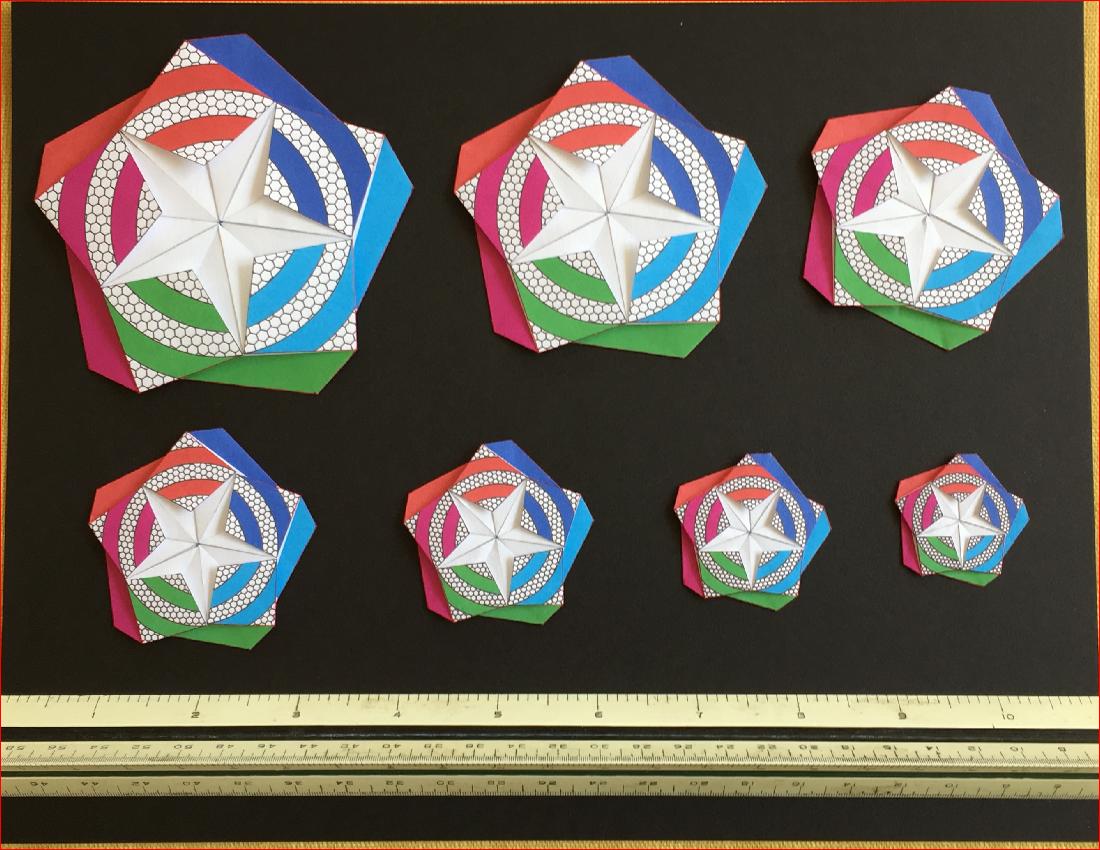 There are 2 basic ways to accomplish "Twist Fold" though there are many variations based on them. Here, as an exmple, a regular pentagon is chosen for the purpose of discussion, but the same idea can be applied to any "N"-gons. Two pentagons, outer and inner, are arranged so that the line connecting the center point and each apex of the inner pentagon passes through ,either the apex of the outer pentagon (Type-II) or the mid-point of the outer pentagon's side (Type-I). We also observe that in both cases angles are divided into 4 equal parts, at each mid-point of the side (Type-I) or at each apex (Type-II). So the each angle is Type-I 180/4 = 45 degrees Type-II 108/4 = 27 degrees Typical diagrams and their dimensions are shown in the following figures. |