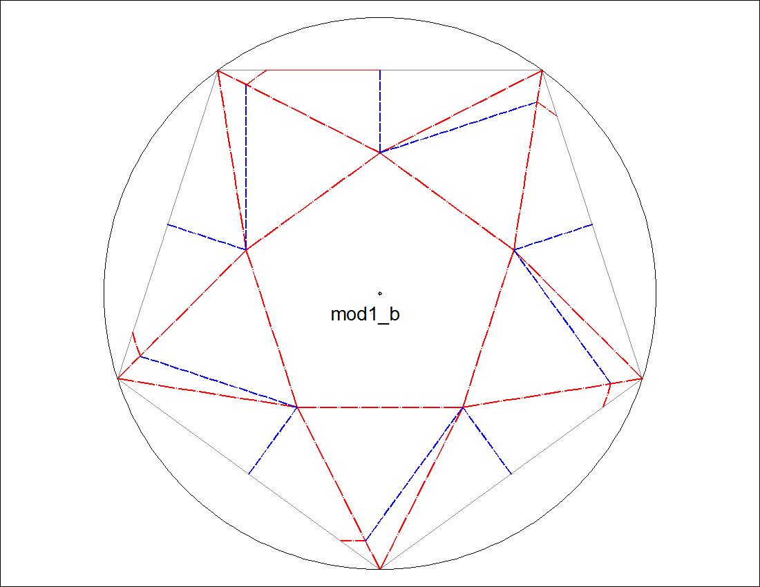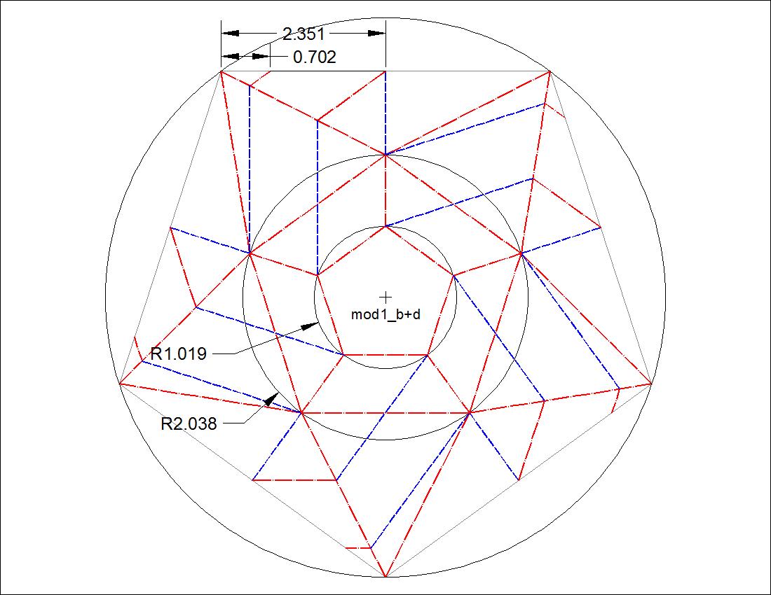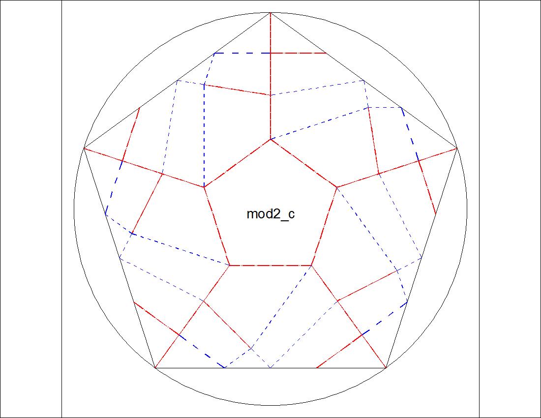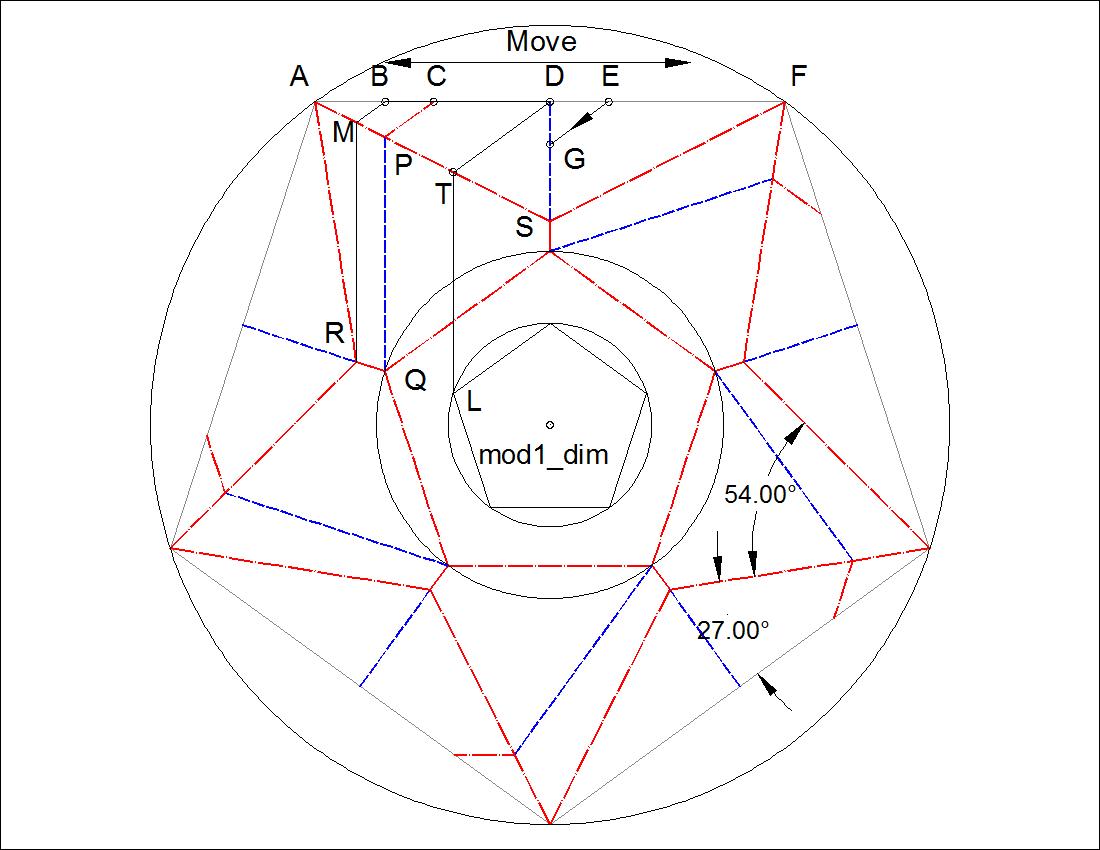 Here we will discuss how to apply some variations to these base model and obtain the aesthetically satisfying models . A few examples are shown in Fig 3-3A & 3B. Fig 3-3A: note that radii of the star in front and pentagon in the back are the same length. Fig 3-3B: note two overlapping pentagons at the center area. |