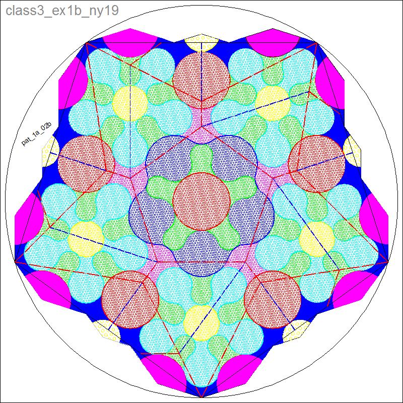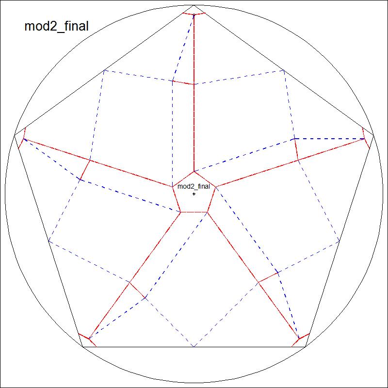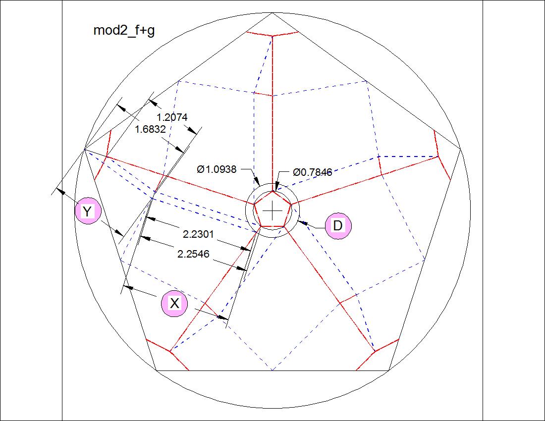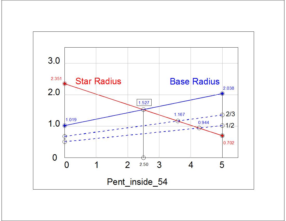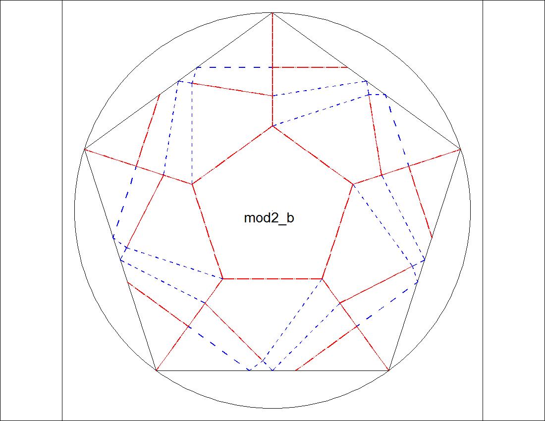 Here we will discuss how to apply some variations to these base model and obtain the aesthetically satisfying models . A few examples are shown in Fig 3-3A & 3B. Fig 3-3A: note that radii of the star in front and pentagon in the back are the same length. Fig 3-3B: note two overlapping pentagons at the center area. |
