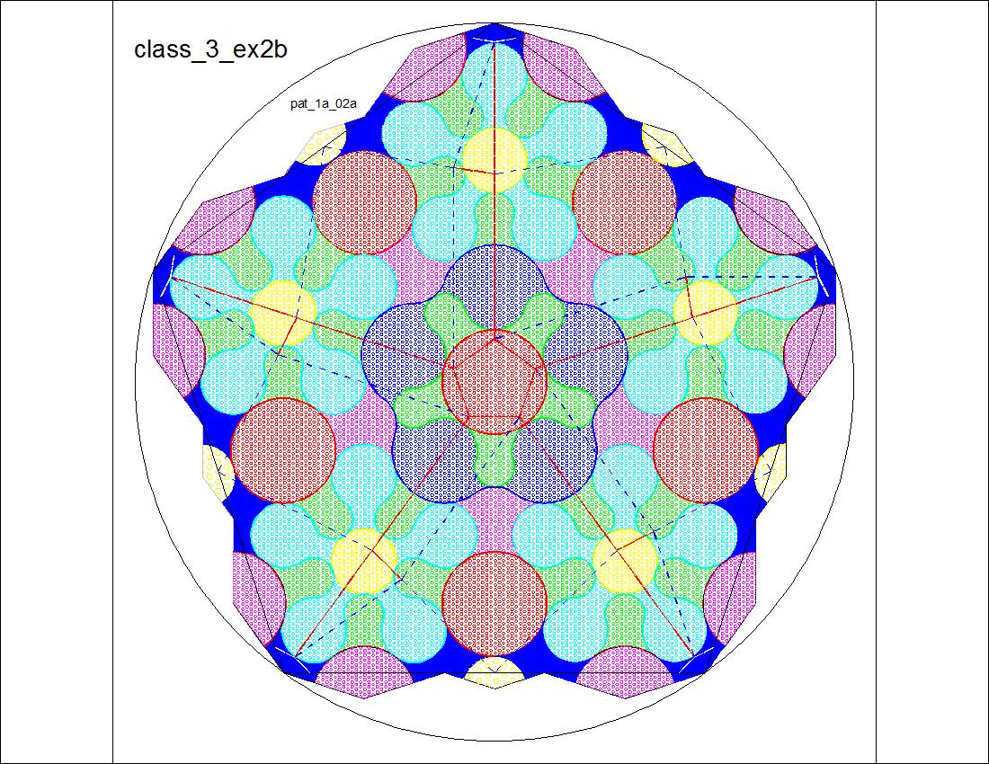 In this class we make a pentagon medal with an opening at the center. To help the attendant to understand the folding diagram, a rectangular vellum sheet is used in a practice folding exercise. Result shown in Fig 2-1. The final target is to make a nice art piece as shown in Fig 2-2 using a paper with folding lines and five axis symmetric pattern printed. |