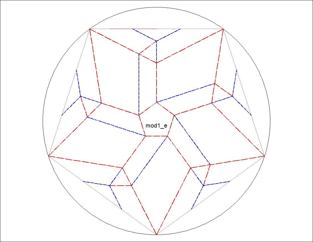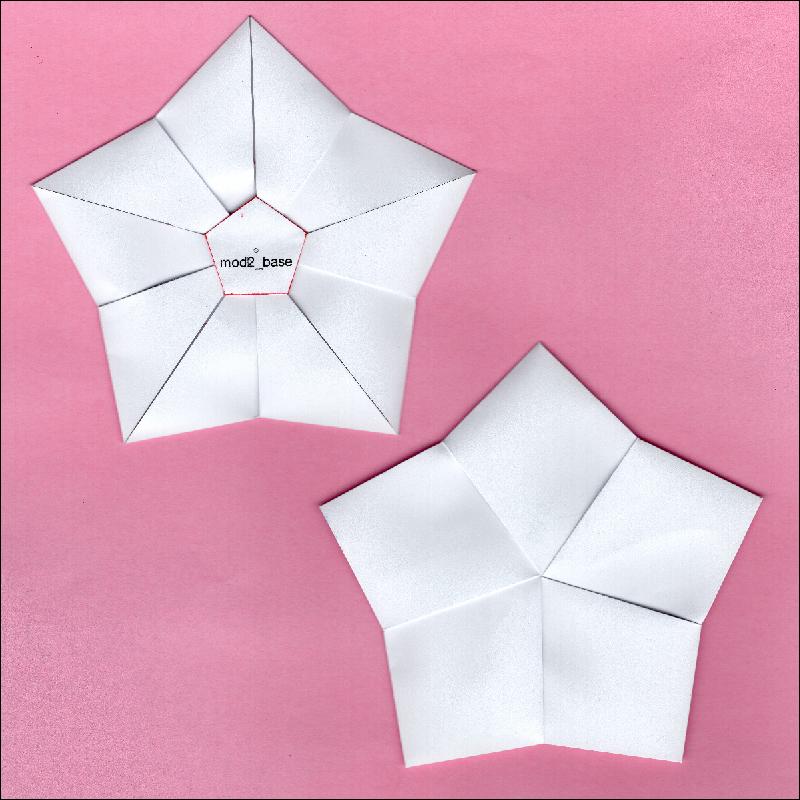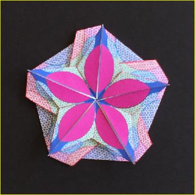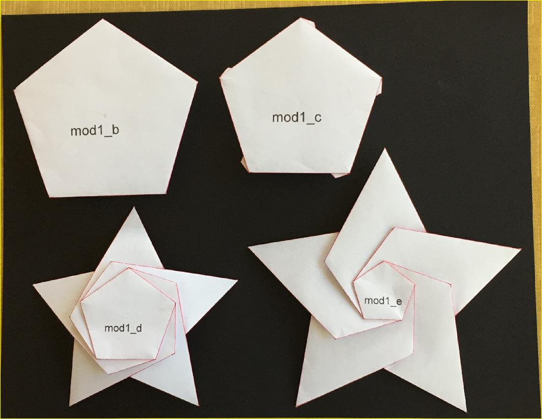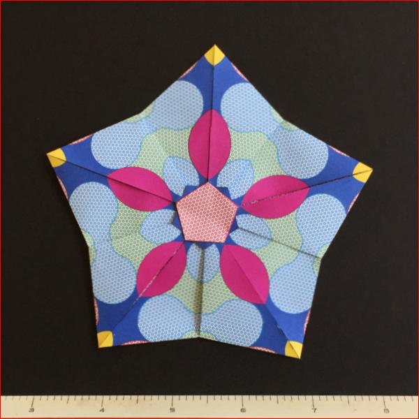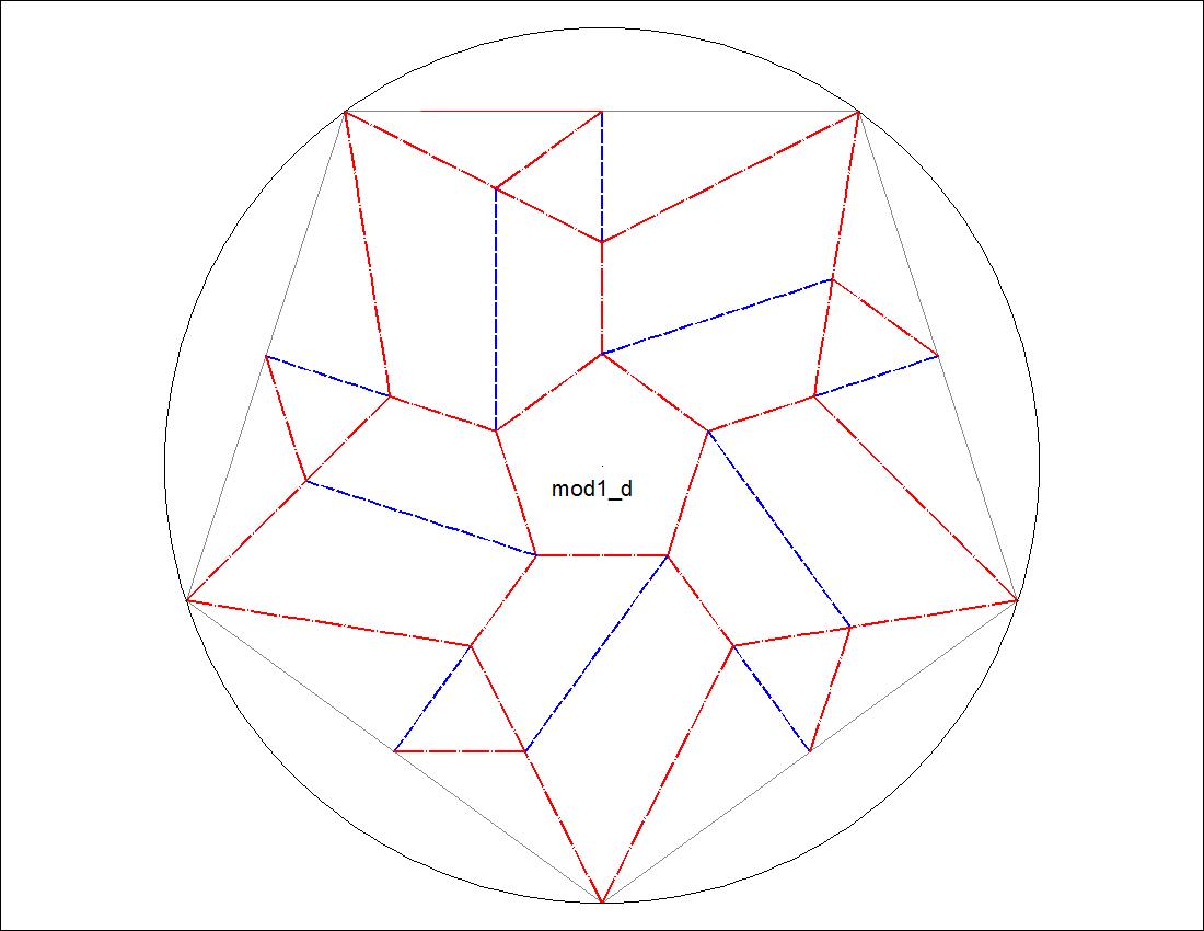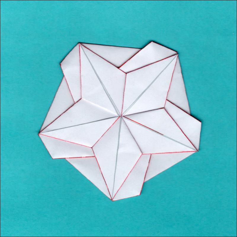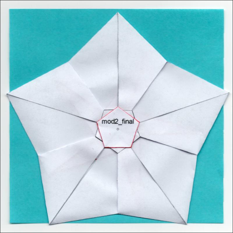 First fix the printed paper atop a heavy weight paper using tape. Then score all the red and blue lines using a ruler and a ball point pen. After scoring is done, peel off the scored paper. Using a scissor, cut along the outer pentagon boundary lines. Precrease mountain fold lines, then valley fold lines. Construction is similar to the process used in the vellum exercise session. |