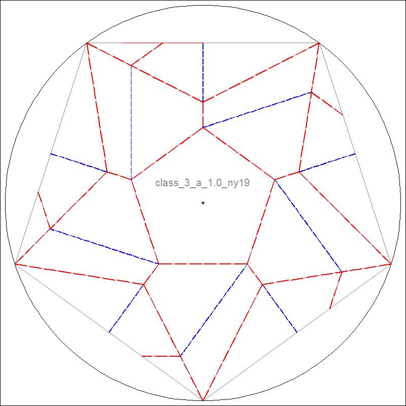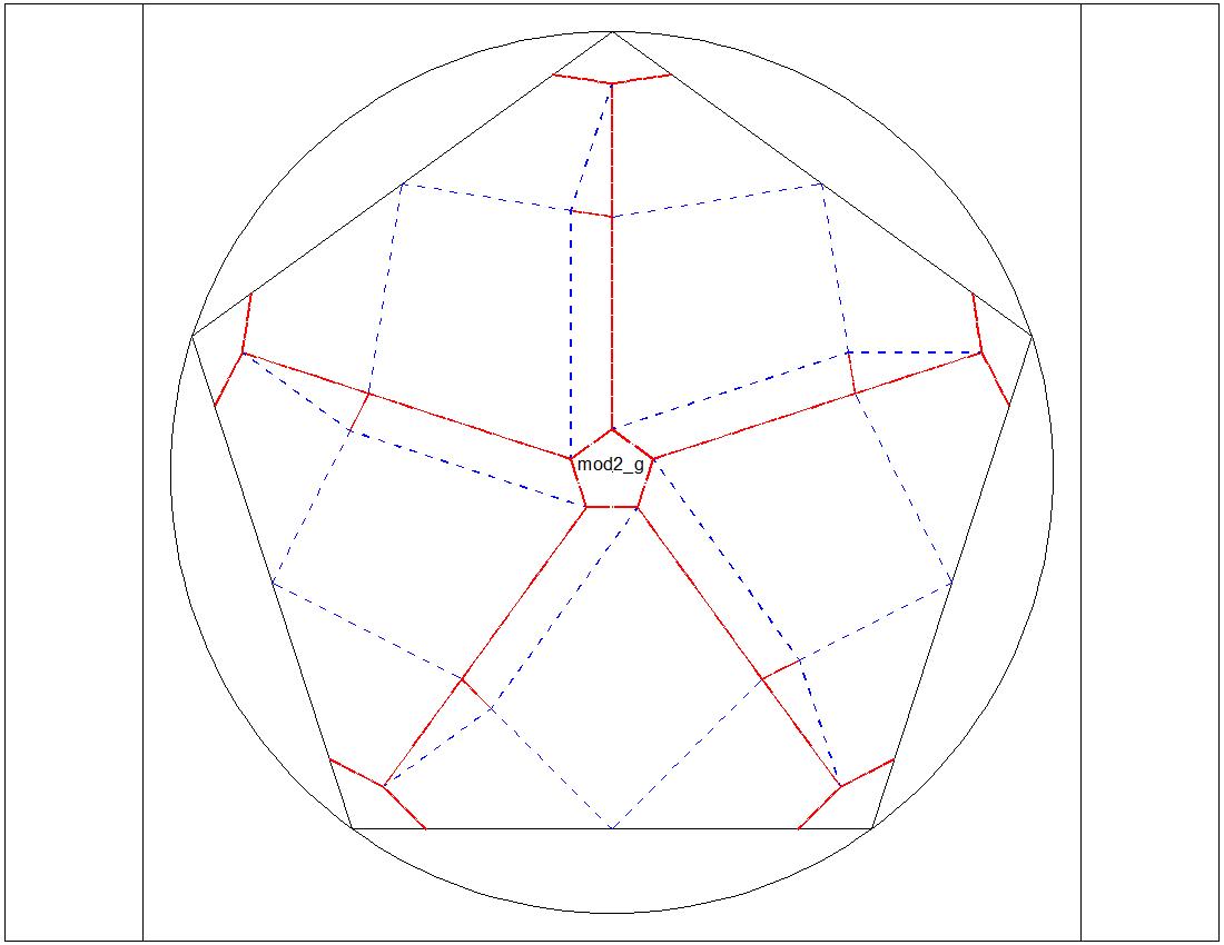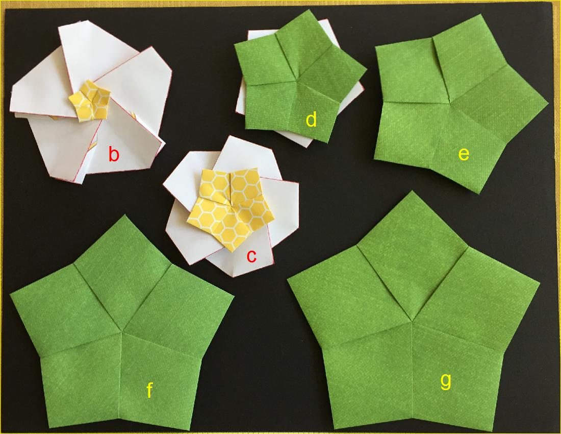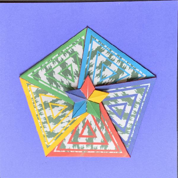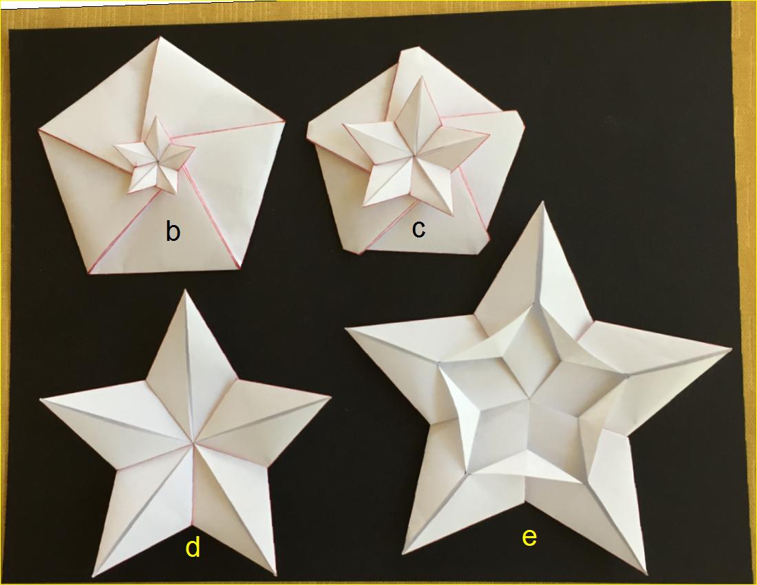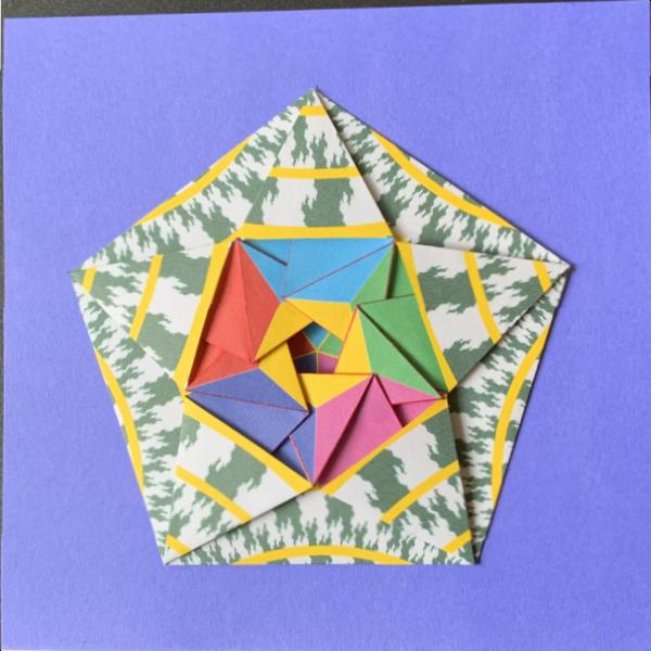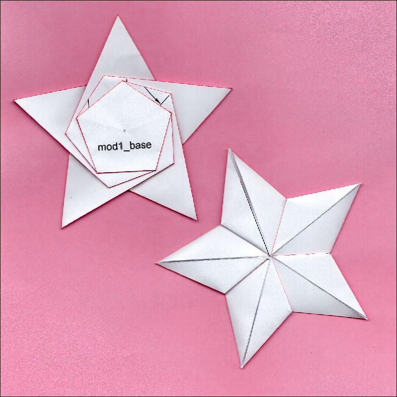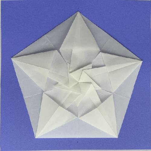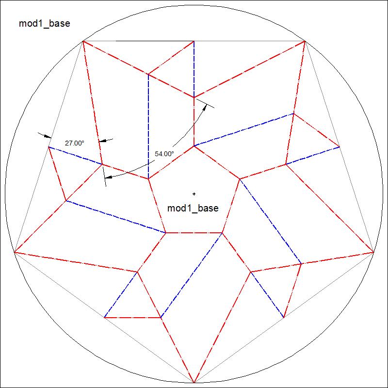 First fix the printed paper atop a heavy weight paper using tape. Then score all the red and blue lines using a ruler and a ball point pen. After scoring is done, peel off the scored paper. Using a scissor, cut along the outer pentagon boundary lines. Precrease mountain fold lines, then valley fold lines. Construction is similar to the process used in the vellum exercise session. |