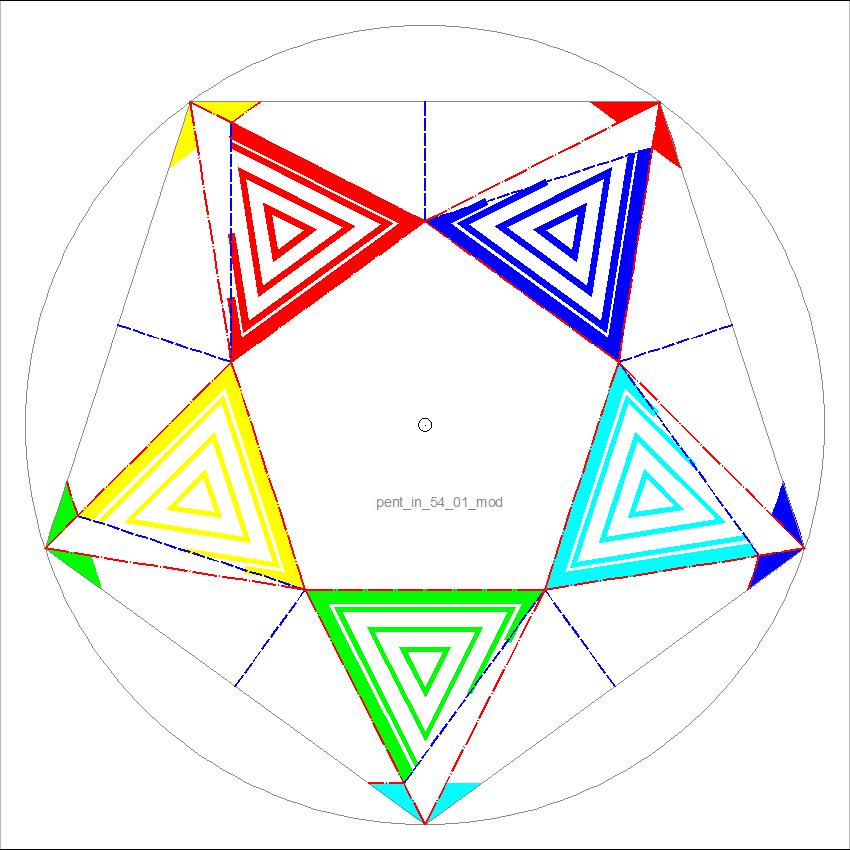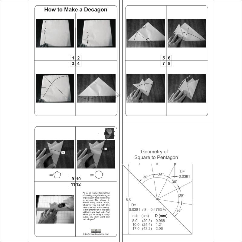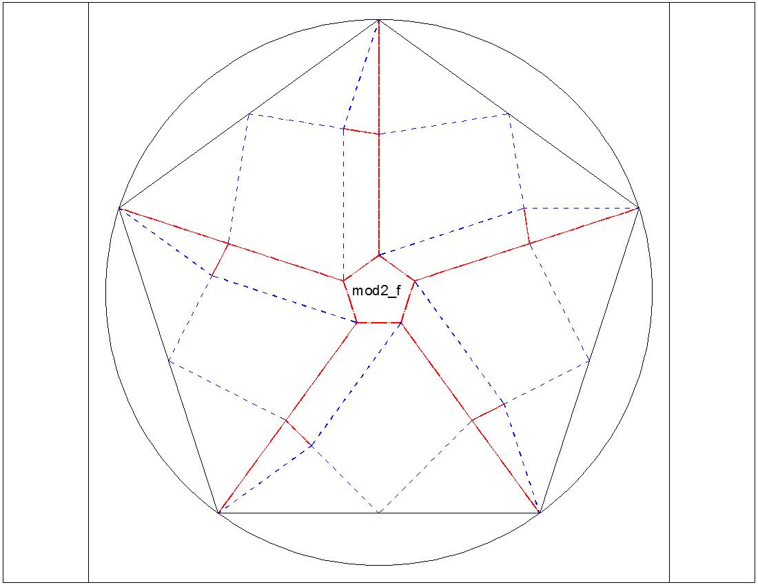 The first step is to cut out a pentagon from a square or rectangular paper. Here a commercially available light weight vellum paper is used. The procedure is shown in the following web site. "How to Make a Decagon" URL: http://origami.oschene.com/cp/DEcagon%20SCP.pdf by Philip Chapman-Bell . The reason I like this method is that most of the lines created in the process is used effectively when this model is folded. At the end of the original PDF file, a small drawing is added to show the discrepancy of this method against the exact pentagon geometry. |