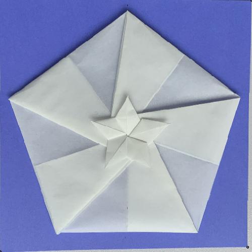 In this class we make a pentagon medal with an internal star at the center. To help the attendant to understand the folding diagram, a rectangular vellum sheet is used in a practice folding exercise. Result shown in Fig 1-1. The final target is to make a nice art piece as shown in Fig 1-2 using a paper with folding lines and five axis symmetric pattern printed. |