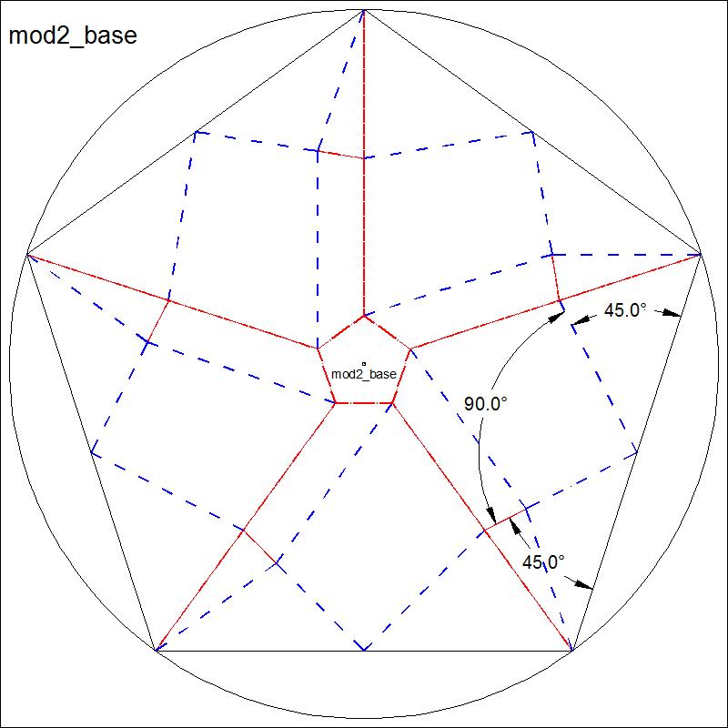 There are 2 basic ways to accomplish "Twist Fold" though there are many variations based on them. Here, as an exmple, a regular pentagon is chosen for the purpose of discussion, but the same idea can be applied to any "N"-gons. Two pentagons, outer and inner, are arranged so that the line connecting the center point and each apex of the inner pentagon passes through ,either the apex of the outer pentagon (Type-I) or the mid-point of the outer pentagon's side (Type-II). We also observe that in both cases angles are divided into 4 equal parts, at each mid-point of the side (Type-II) or at each apex (Type-I). So the each angle is Type-I 108/4 = 27 degrees Type-II 180/4 = 45 degrees Typical diagrams and their dimensions are shown in the following figures. |