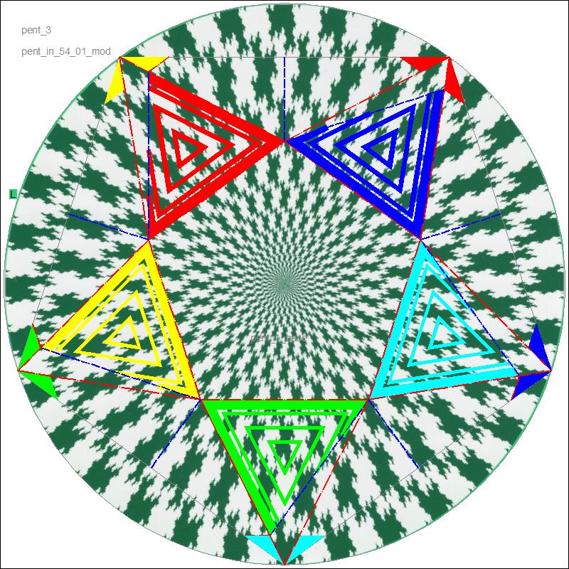The paper prepared for this model has both front and back printed. The pattern on one side (Fig 2-5A) is a spiral pattern with multiple concentric circles and this is the outside pattern in the finished model. The other side (Fig 2-5B) has folding lines and the colored sections ,which is the interior pattern of the model. First fix the printed paper atop a heavy weight paper using tape. Then score all the red and blue lines using a ruler and a ball point pen. After scoring is done, peel off the scored paper. Using a scissor, cut along the outer pentagon boundary lines. Precrease mountain fold lines, then valley fold lines. Construction is similar to the process used in the vellum exercise session. |