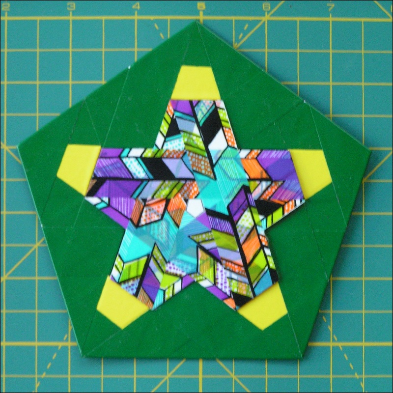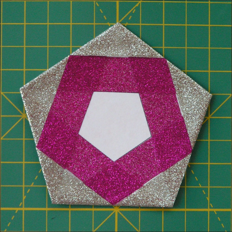 This will cover the space between "green" pentagons. Short end goes down